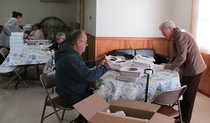 There was fresh coffee and cookies for the workers during the morning and then it was time to have lunch. Mike Komischock offered a prayer and of course there were more homemade cookies for all to devour. Happy Birthday wishes were extended to two long time helpers, Marge Hoppey and Ted Sherrock.