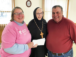 Pictured above are GHRL members making presentation to Mother Marija--Rick Hoppey, Judy Kringer, Mike Komishock, Mother Marija, Judy Betterly, Agnes Rohrbach, Ann Marie Betterly and Dorothy Foran.